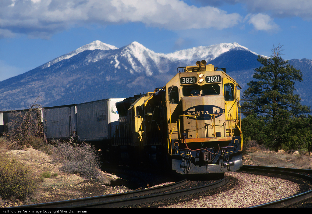 | An eastbound Santa Fe freight led by EMD GP50 No. 3821 sweeps through a curve between Cosnino and Darling, Arizona, on the morning of April 20, 1990.