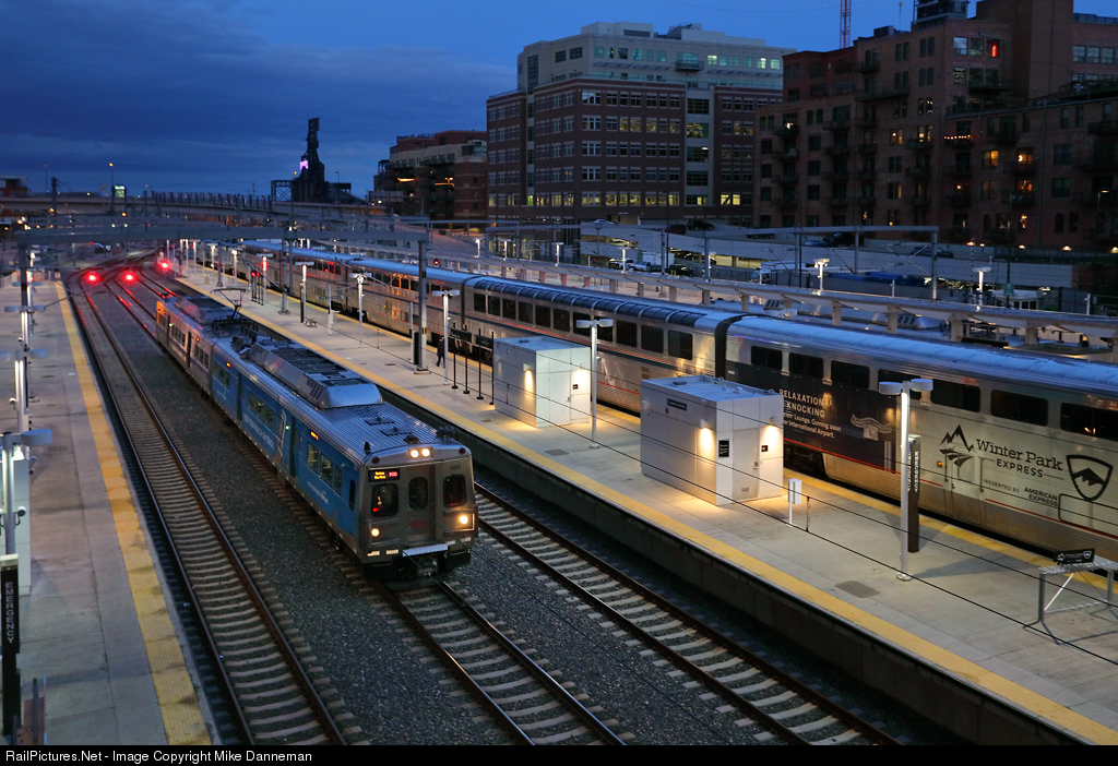 Dusk settles over Denver, Colorado, on March 13, 2020, as a RTD G Line commuter train arrives from Wheat Ridge at Denver Union Station. Over on Track 5, the Winter Park Express ski train has also recently arrived and has already unloaded its passengers and gear.