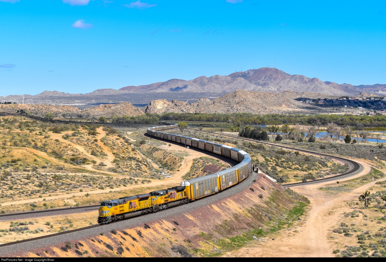 A westbound (UPRR "southbound") autorack train bound for West Colton makes it's way down Cajon Pass with UP SD70ACe-T4 3045 and SD70ACe 8414 at the front and AC44CWCTE 5903 at the rear. Because this was my first time seeing a Tier 4 ACe and on-point, I chased it down to Hesperia, Summit, and Mormon Rocks. While I did beat it to Swarthout Canyon, I ended up waiting at the wrong crossing, as it took the Cajon Subdivision instead of the Palmdale Cutoff. At least I got some great photos of it from where I caught it.