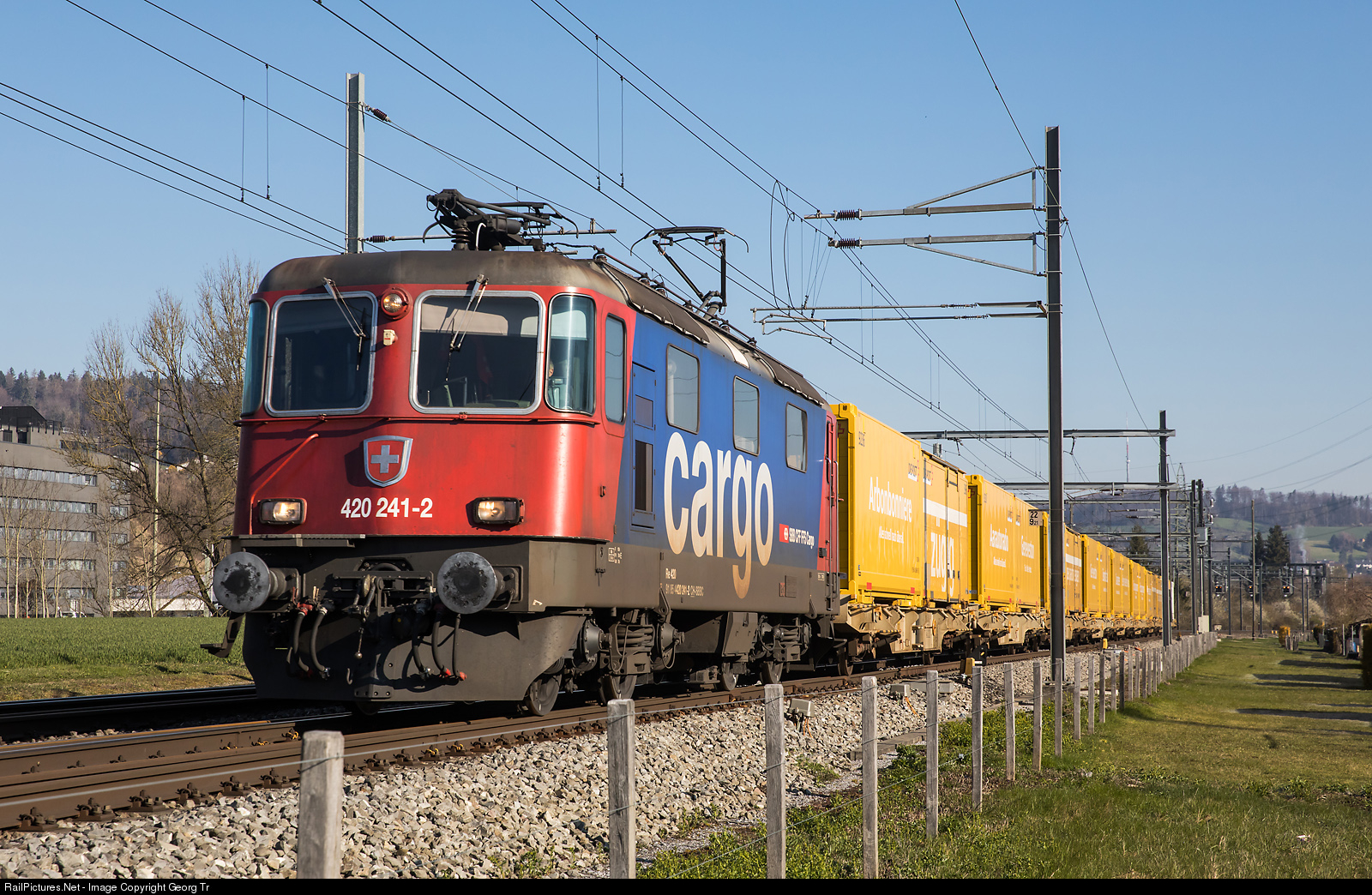| Re 420 # 241 of the SBB is pulling the Cargo Express and mail train 50064 from Frauenfeld parcel sort center to Daillens parcel sort center, with a stop in Härkingen, in Winterthur Tössmühle. This train is running at 120 km/h. |