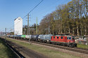 | Empty tank car train 66446 from Schwarzenbach to the Limmattal shunting yard (RBL) is running through Winterthur with locomotive Re 420 # 249. In the background the Neumühle grain silo, not used any more. |
