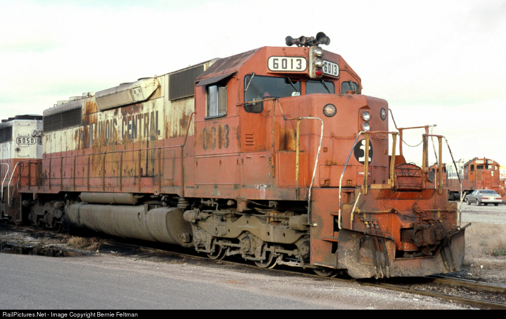 Illinois Central SD40A #6013, at East Thomas Yard, was one of 18 units built with the oversized fuel tank. #6013 was built August 1969. Unit later was re# Illinois Central Gulf #6013. In August 1995, 6013 was rebuilt to SD40-2R standards and re# back to IC #6013.
