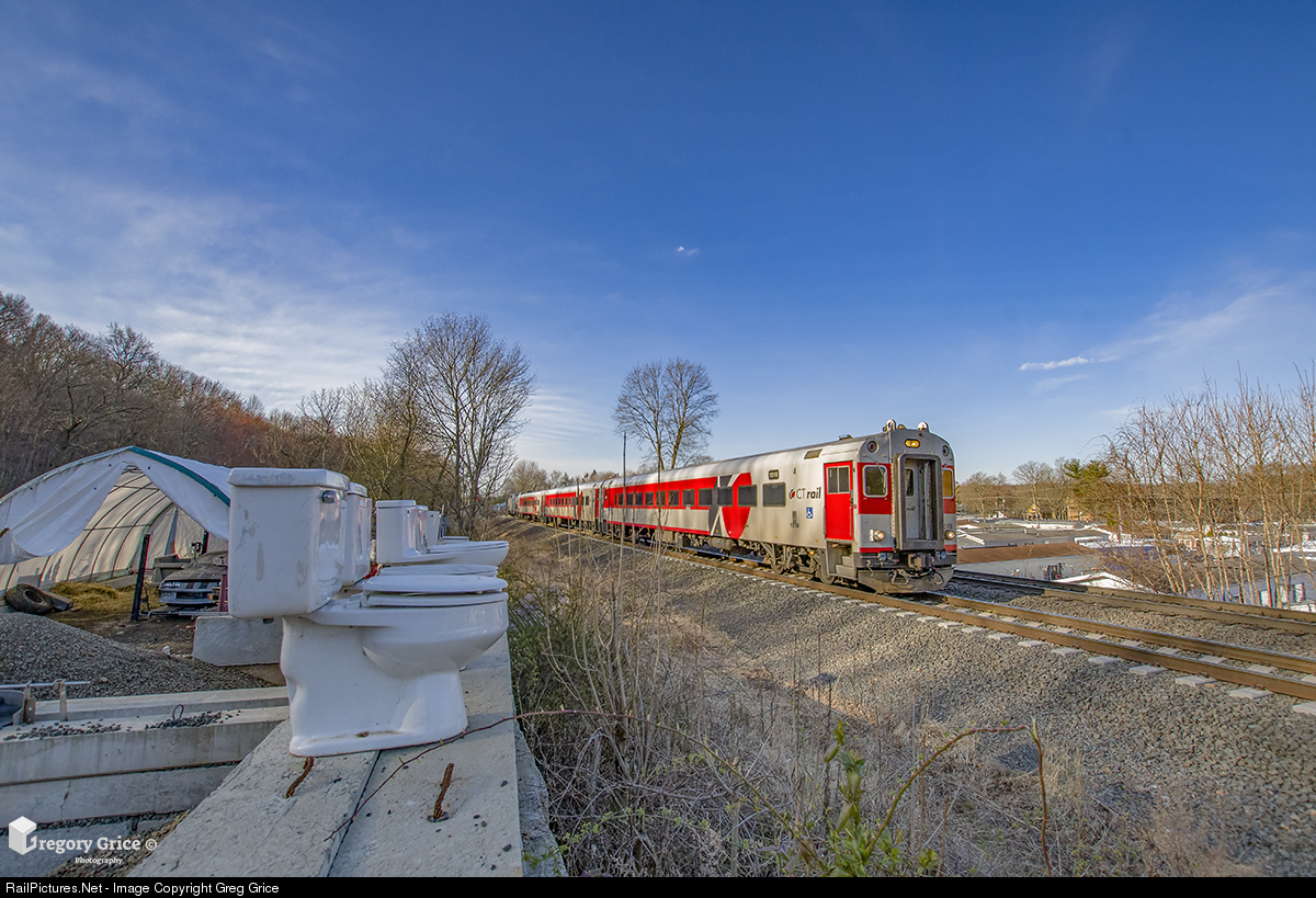 "Toilets Meet Toilets at A1" Northbound CTrail train 4404 coasts past A1 Quality Rooter Sewer & Drain Cleaning in Meriden, Connecticut. A1 is one of several local businesses along the Hartford Line. Established in 1991, A1 provides drain cleaning, rooter services, septic tank locating and excavation to Meriden, CT and surrounding areas. The "toilet wall", which is seen by several Hartford Line passengers, was the creative idea of John Rees, one of the company's family members.