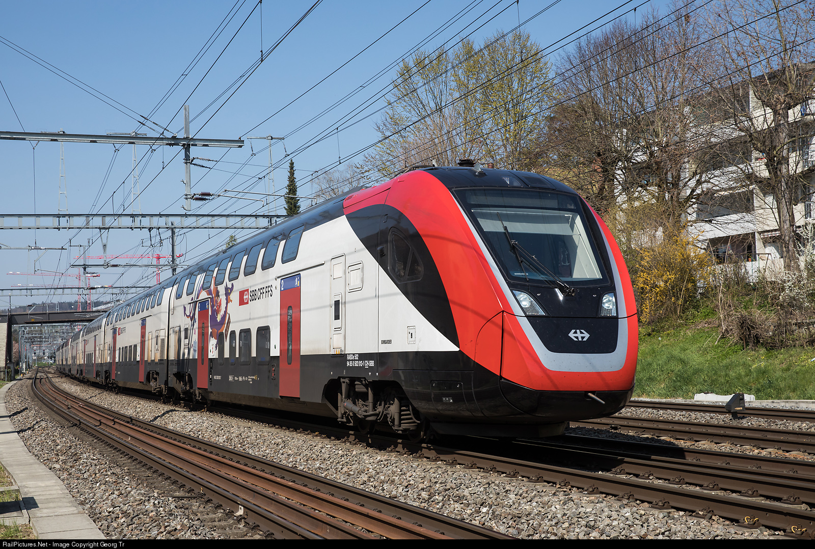 | "FVD" or "FV-Dosto" RABDe 502 # 013 of the SBB is running the IR 3267 of the line IR 13 from Zürich via Winterthur-St.Gallen-Sargans to Chur, between Winterthur and Winterthur Grüze. |