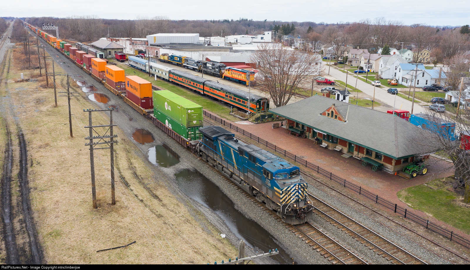 A CEFX AC4400 lease unit leads CSX intermodal Q166, a CP train that utilizes CSX trackage between Chicago and Buffalo, as the train passes by the depot at North East, Pennsylvania. The former LS&MS depot is now home to the Lakeshore Railway Museum.