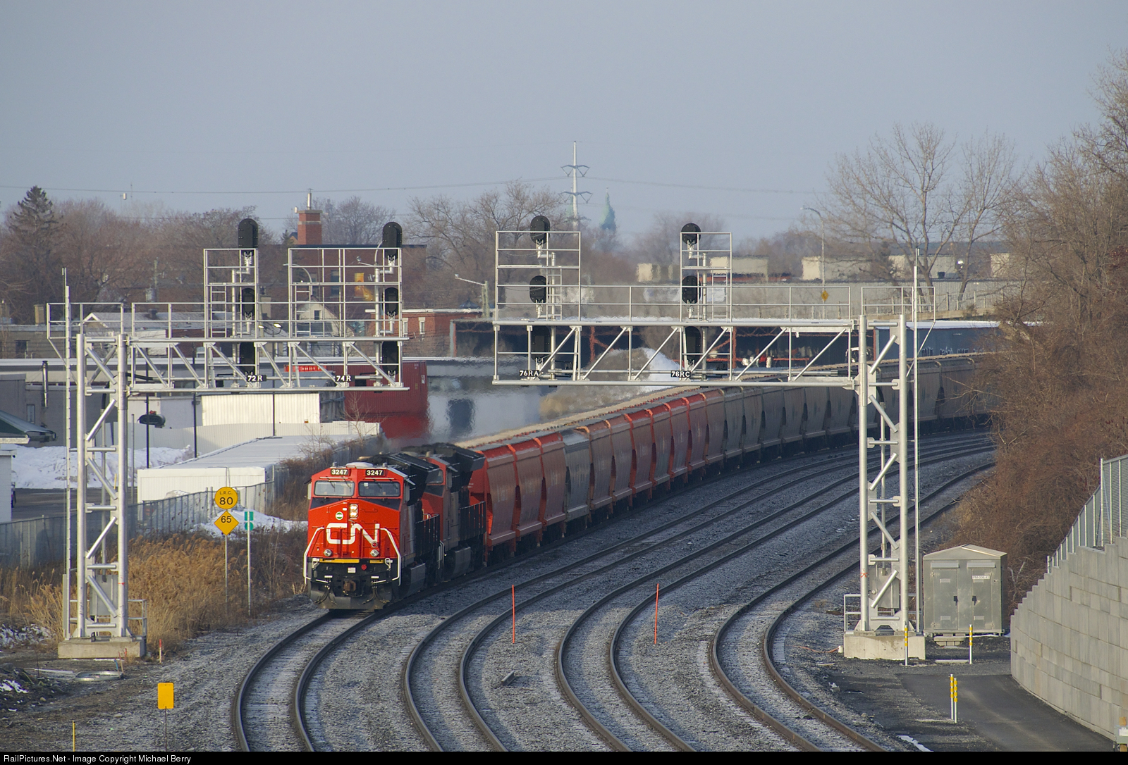 A 205-car CN B730 is approaching Turcot Ouest where it will change crews. Power is CN 3247 & CN 3012 up front, CN 3876 mid-train and CN 3002 on the tail end.