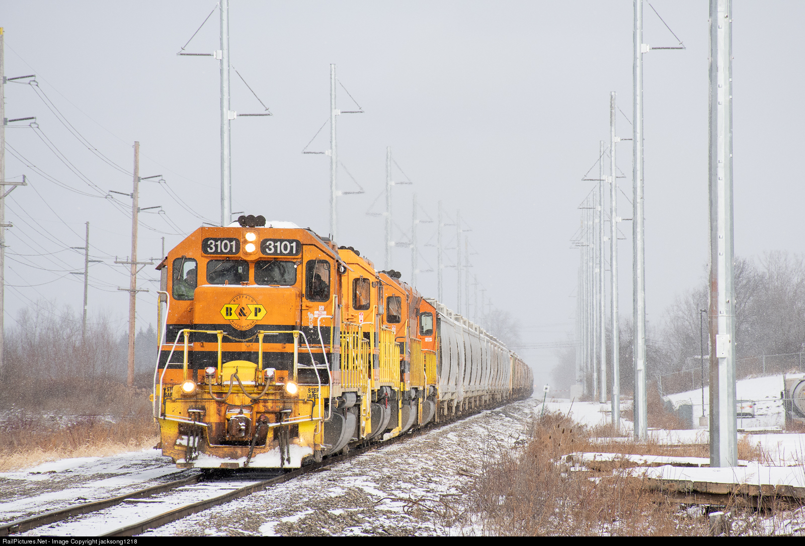 | Buffalo & Pittsburgh EMD GP40 number 3101 is on point of the Rochester & Southern's Brooks Ave Yard to Silver Springs train as it works its way south out of Brooks passing the newly installed power lines the line both sides of the right of way. |