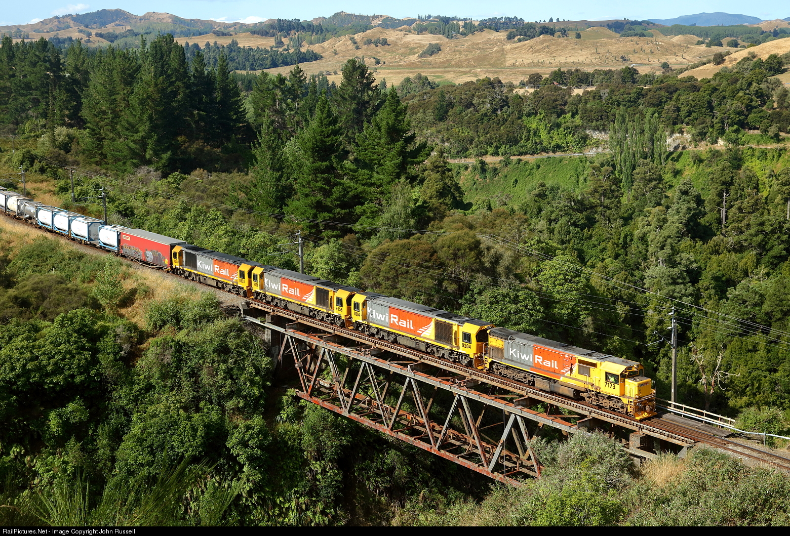 7173 leads DL trio 9204, 9158, and 9233 across the 58 m (190 ft) high Toi Toi Viaduct. The DF class were built by EMD Canada and entered service in 1979 with most now working on South Island lines. It's getting rare to find trains with a lead loco other than a DL these days. This, of course, is a balancing lash up; 13,000Hp is not needed on this train.