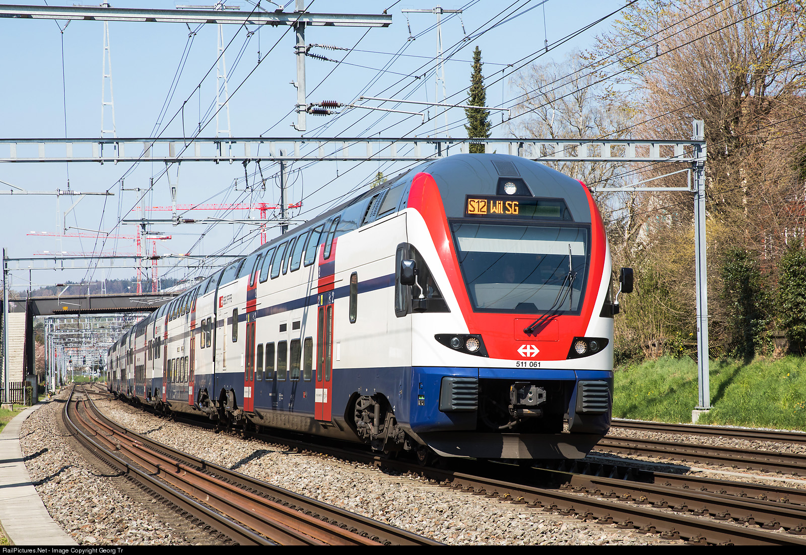 "RVD" (doubledeck train for regional services) RABe 511 # 061 of the SBB, built by StadlerRail, is running the S 12 service 19243 of the Zürich commuter network from Brugg (AG) via Baden-Dietikon-Zürich-Stettbach-Winterthur to Wil (SG), running between Winterthur and Winterthur Grüze. In the Limmattal and between Winterthur and Wil (SG), the train stops at each station, while between Zürich HB and Winterthur, it serves as very fast connection with stops in Stadelhofen and Stettbach only. The SBB has 69 of this 6-car trains and 24 of the shorter 4-car-version. 49 of the 6-car-version have the blue/white "ZVV" paint scheme and are running for the Zürich commuter network. All other RVD have a grey/white paint scheme and are running for Regio Express or Inter Regio services.