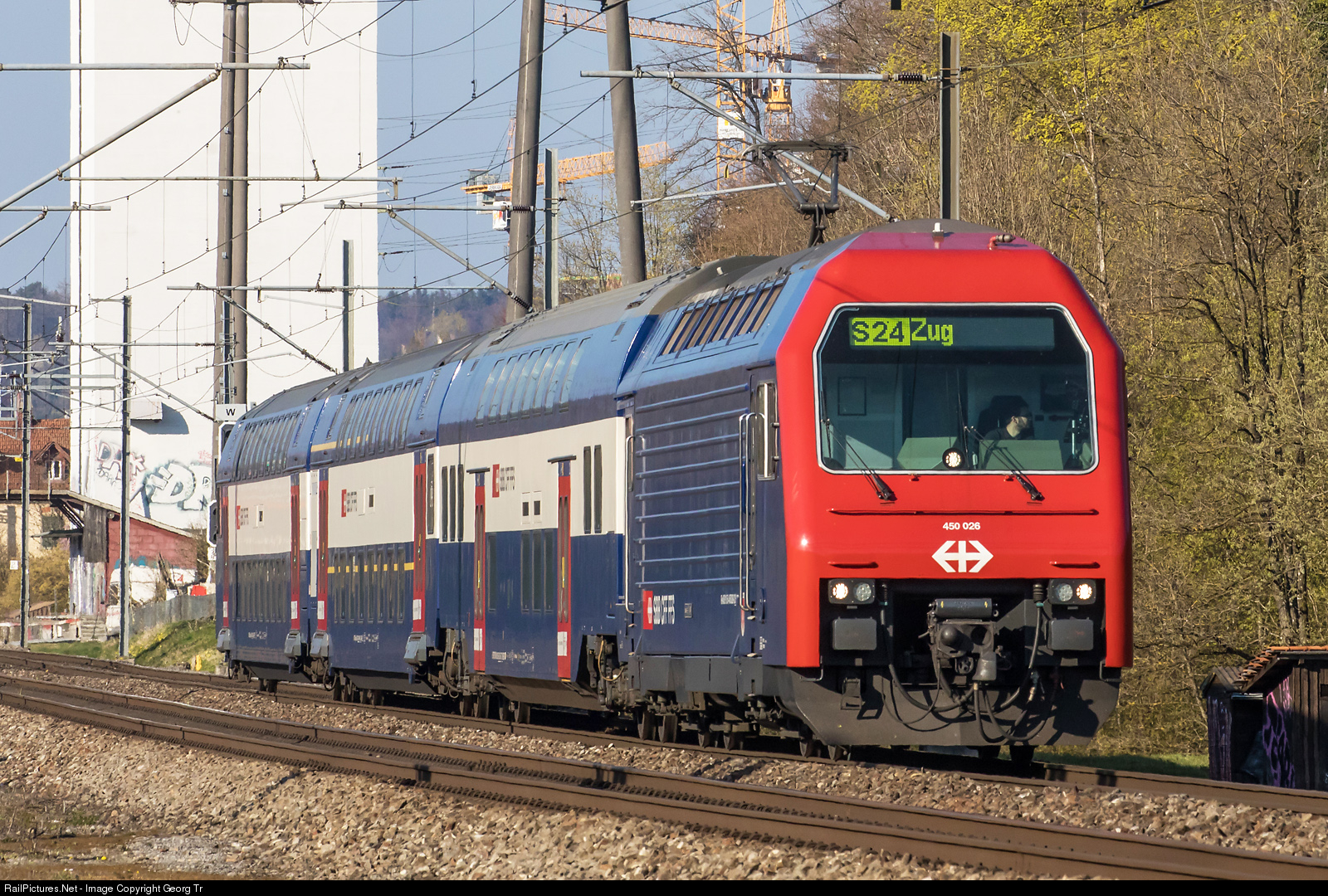 | DPZ (doubledeck push-pull train) with locomotive Re 450 # 026 is leaving Winterthur as 20469 of the line S 24 from Thayngen via Schaffhausen-Winterthur-Zürich Airport-Zürich-Thalwil-Zug. The SBB has 113 of this trains for the Zürich commuter network. |