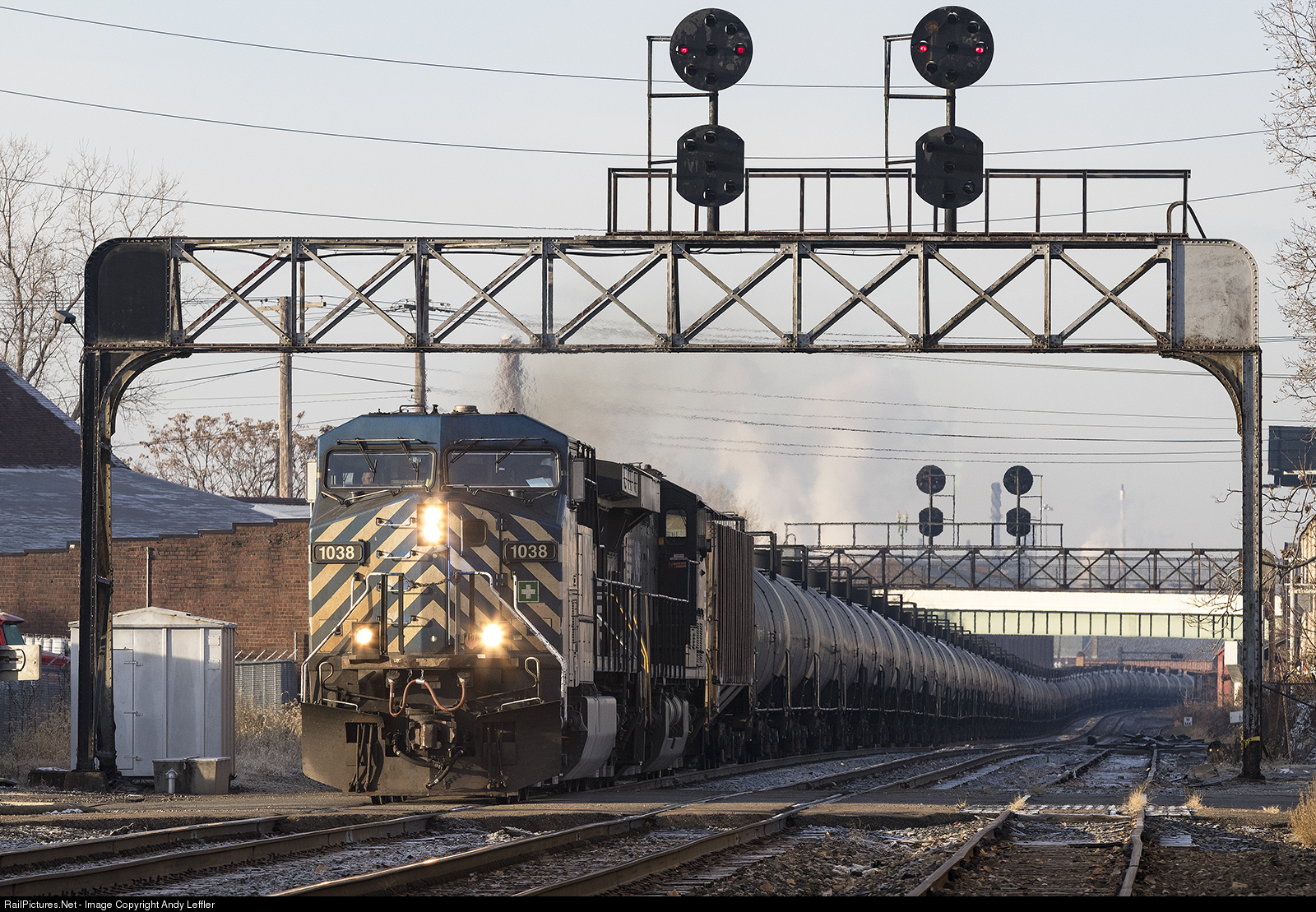 Eastbound oil loads head under the PRR bridges at "Wandle" as the temperature rises to a crisp 20 degrees with windchill. Unfortunately these signals are no longer standing.