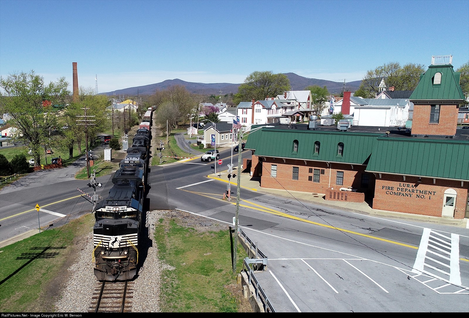 | NS train 15T clears the signal at MP 88.5 and approaches the station while passing the Luray Fire Department - Company 1 on a sunny, but a windy afternoon in the Shenandoah Valley. #716 |