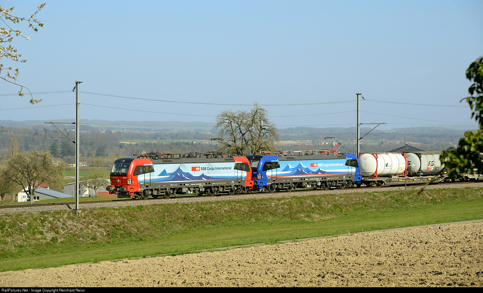 SBB Cargo 193 473 (red) and 193 527 (blue) pass Lottstetten area with a container train.
