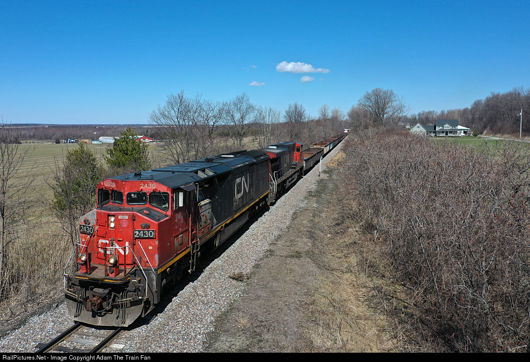 | CN 2430, an increasingly rare GE C40-8M, leads Montreal-Saint Albans manifest train M32421, pictured just 4 miles away from its destination. |