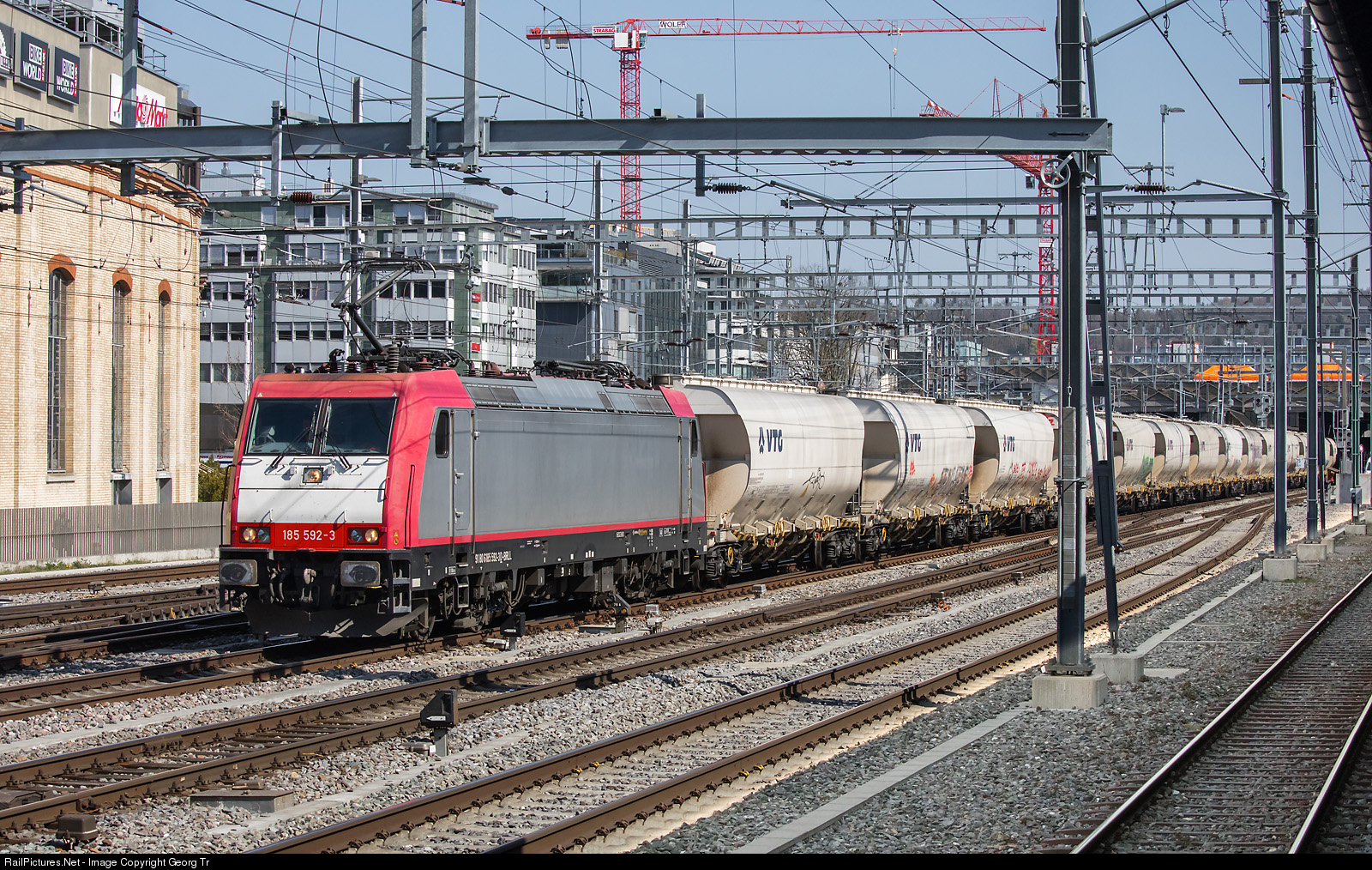 | Bombardier TRAXX F140 AC2 185 # 592 of the austrian LTE (Logistik und Transport Gmbh), in Switzerland running for the EDG (Eisenbahndienstleister Gmbh), is pulling the empty sugar train 48688 from Islikon via Winterthur-Bülach-Schaffhausen-Singen-Schwarzwaldbahn-Rzepin/Poland with Uagnpps cars of the VTG, through Winterthur. |