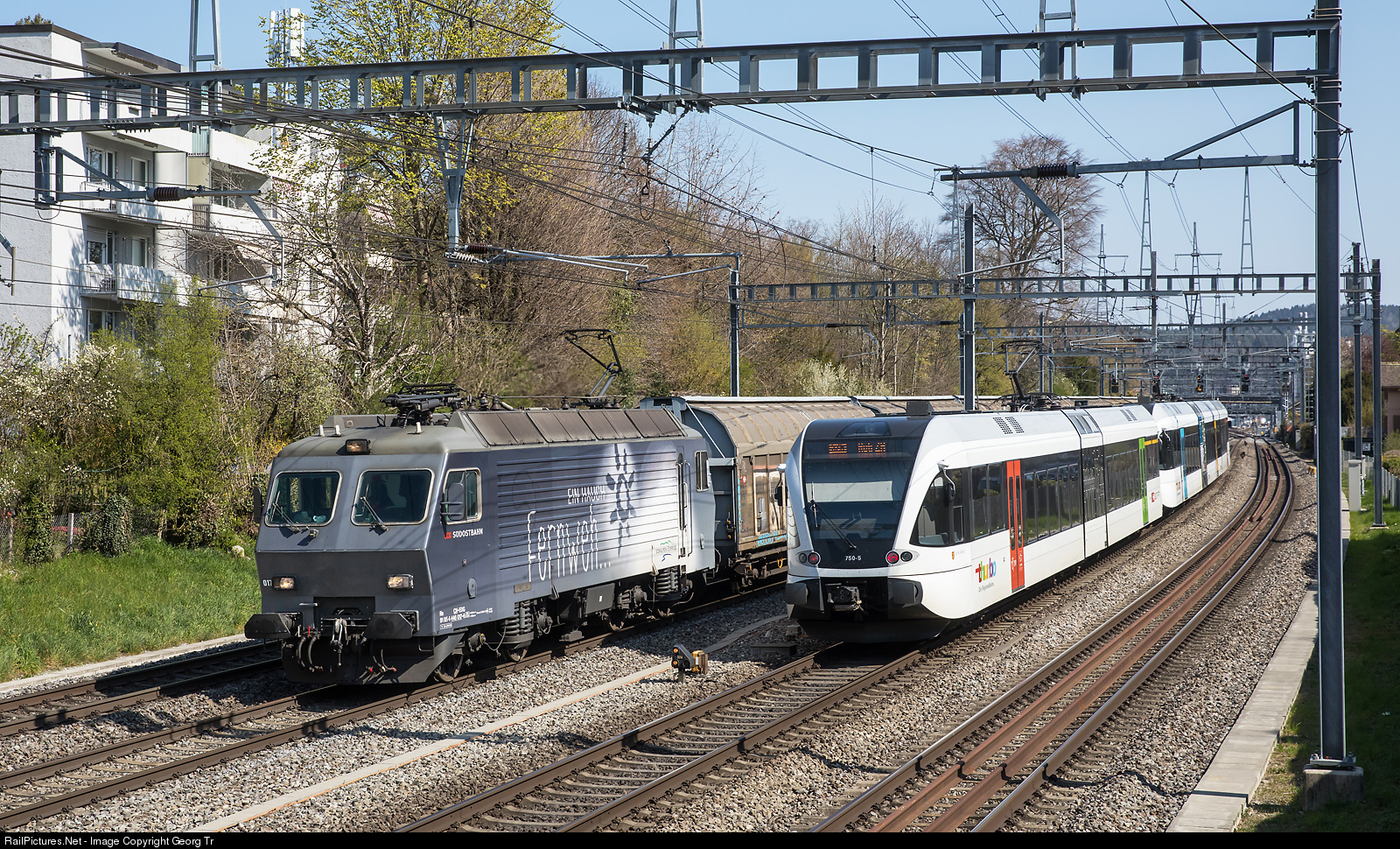 | Re 446 # 017 of the EDG in the "Ein Hauch Fernweh..." (a touch of wanderlust..) paint scheme is pulling the freight train 63184 from Romanshorn to Limmattal shunting yard (RBL) between Oberwinterthur and Winterthur, while the articulated lowfloor regional train RABe 526 # 750 and another of the same series of the THURBO is running in the opposite direction as S 26 from Winterthur to Bauma-Rüti ZH towards Winterthur Grüze. Here, there is the Schwalmenacker crossover station. The Re 446 # 017 ran for the Südostbahn before and is the former Re 4/4 IV # 10103 of the SBB, built in 1982 by SLM and BBC. The EDG is operating the freight train 63184 on behalf of the SBB Cargo on mondays and tuesdays. |