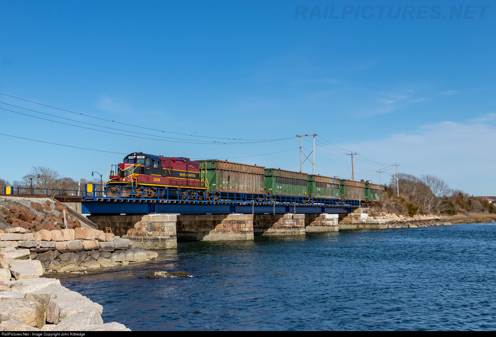 Mass Coastal 2008 leads a short train of municipal waste hoppers across Cohasset Narrows in Wareham, MA.