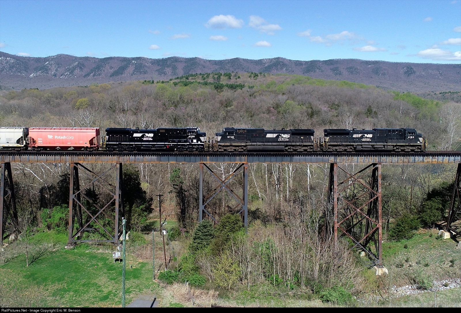 | NS train 18T clears the crosses the bridge at Compton and continues its journey north. You could almost smell the paint on the third engine (NS 4430) even from where I was standing. Social distancing doesn't mean you can't enjoy the beautiful scenery of the Shenandoah Valley. #716 |