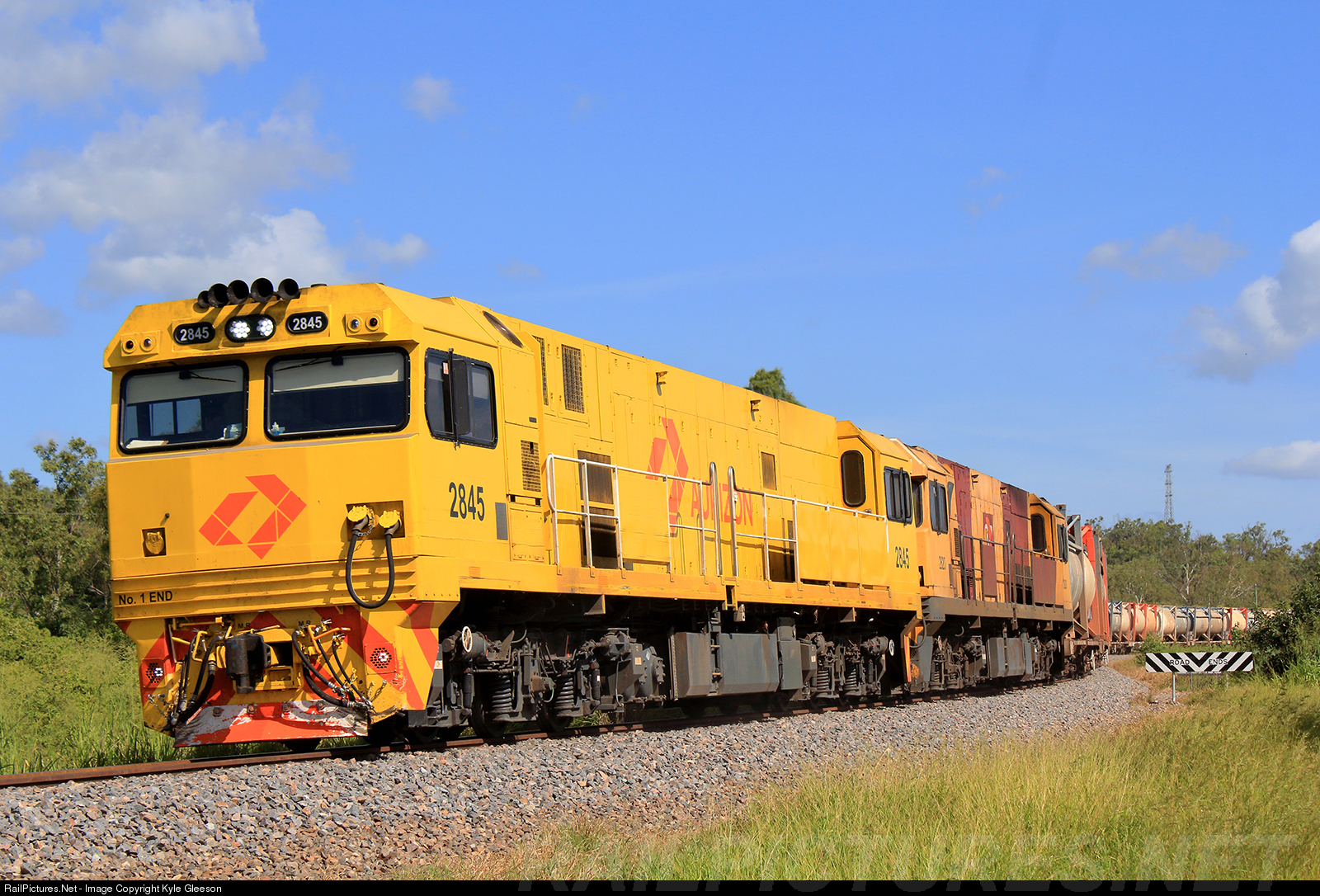 | New and old, 2845 leads 2820 the final 2800 class in bronco livery into Roseneath pulling 9255 Mount Isa to Townsville Mineral Freight. 8/04/20 |