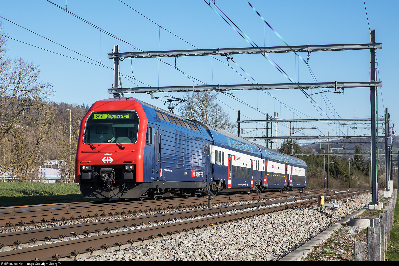| On the S 7 line of the Zürich commuter network, some trains are run with doubledeck "DPZ" and others with "RVD" trains. The DPZ with Re 450 # 039 is running the 18737 from Winterthur via Kloten-Zürich-Meilen to Rapperswil, in Winterthur Tössmühle. |
