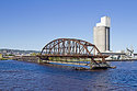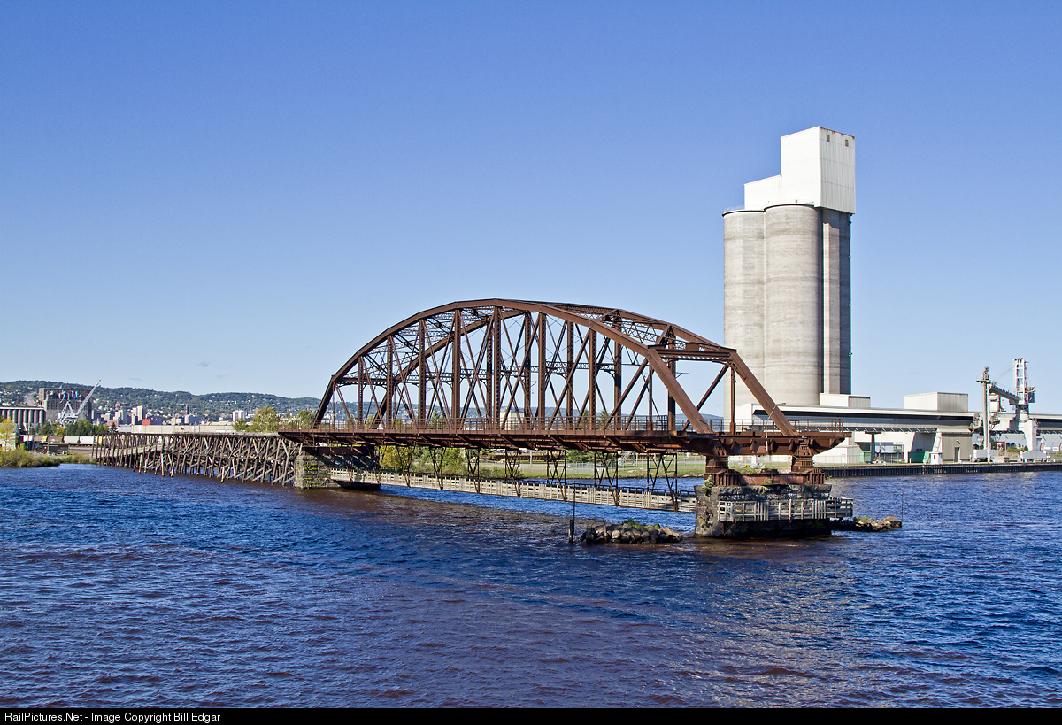 A tour of the Duluth-Superior harbor revealed this last remaining span of the former Great Northern Ry. interstate bridge between Duluth and Superior. Prior to about 1961 this bridge handled most vehicle traffic on U.S. 53 between the two cities. Vehicles operated on the outside of the truss while trains operated through the truss. My understanding is that Soo Line and C&NW used this as well as GN. People can still access this span to view water activities. Ships headed to Superior elevators, the coal docks and CN Duluth ore dock pass through here.