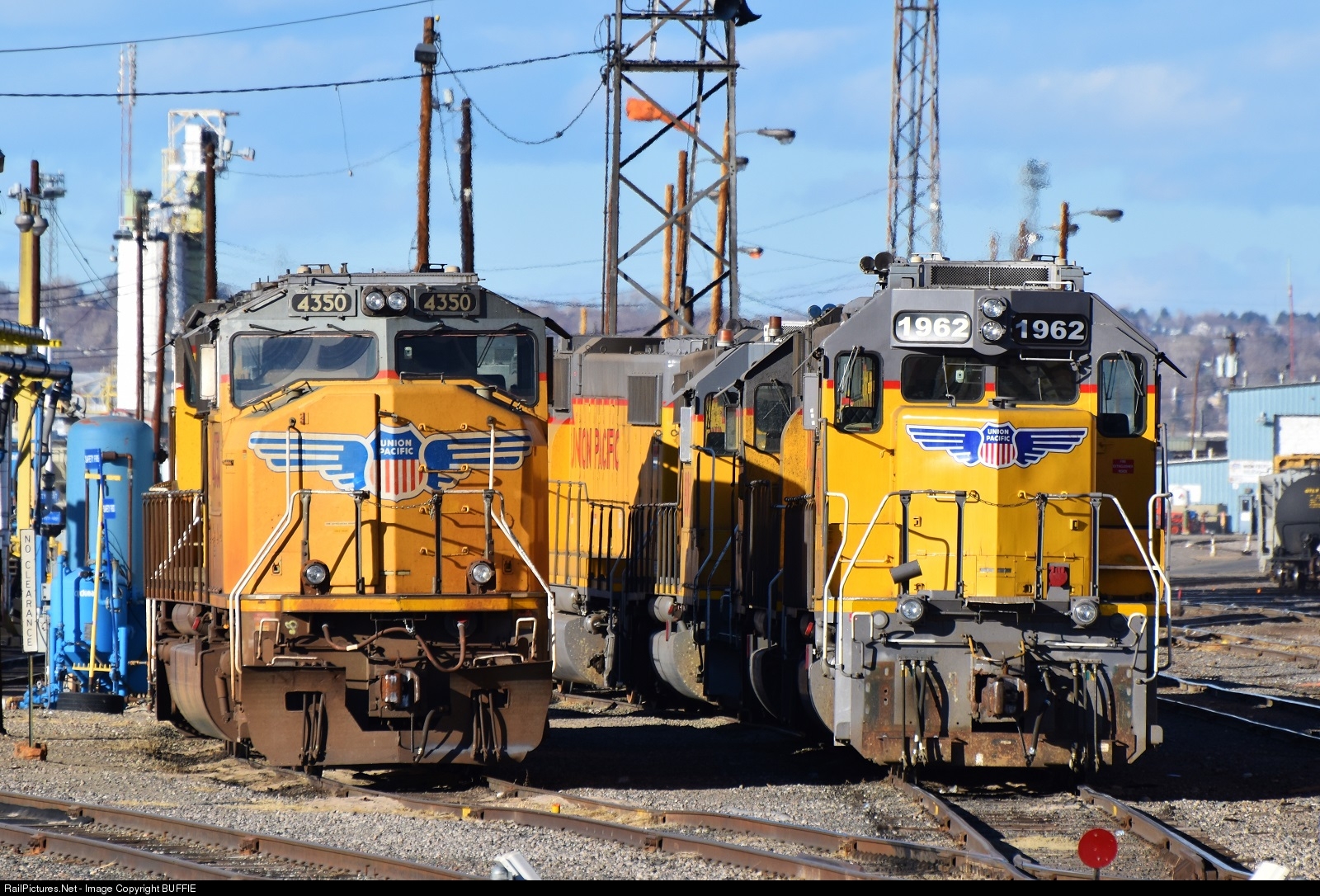| There is always a nice variety of power in the Union Pacific's North Yard. UP 4350 is an SD70M built in 2001 and UP 1962 started life in 1989 as a GP60 for SSW/Cotton Belt. |