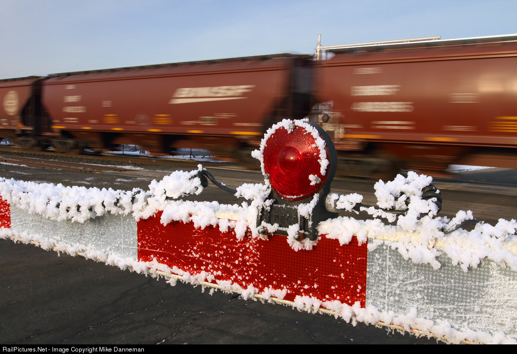After a cold winter night in Ritzville, Washington, conditions were right for everything to be covered with a thick coat of frost on January 23, 2013. An eastbound BNSF grain empty rolls through town over Columbia Street grade crossing with the lowered crossing gates still caked with frost in the morning light.