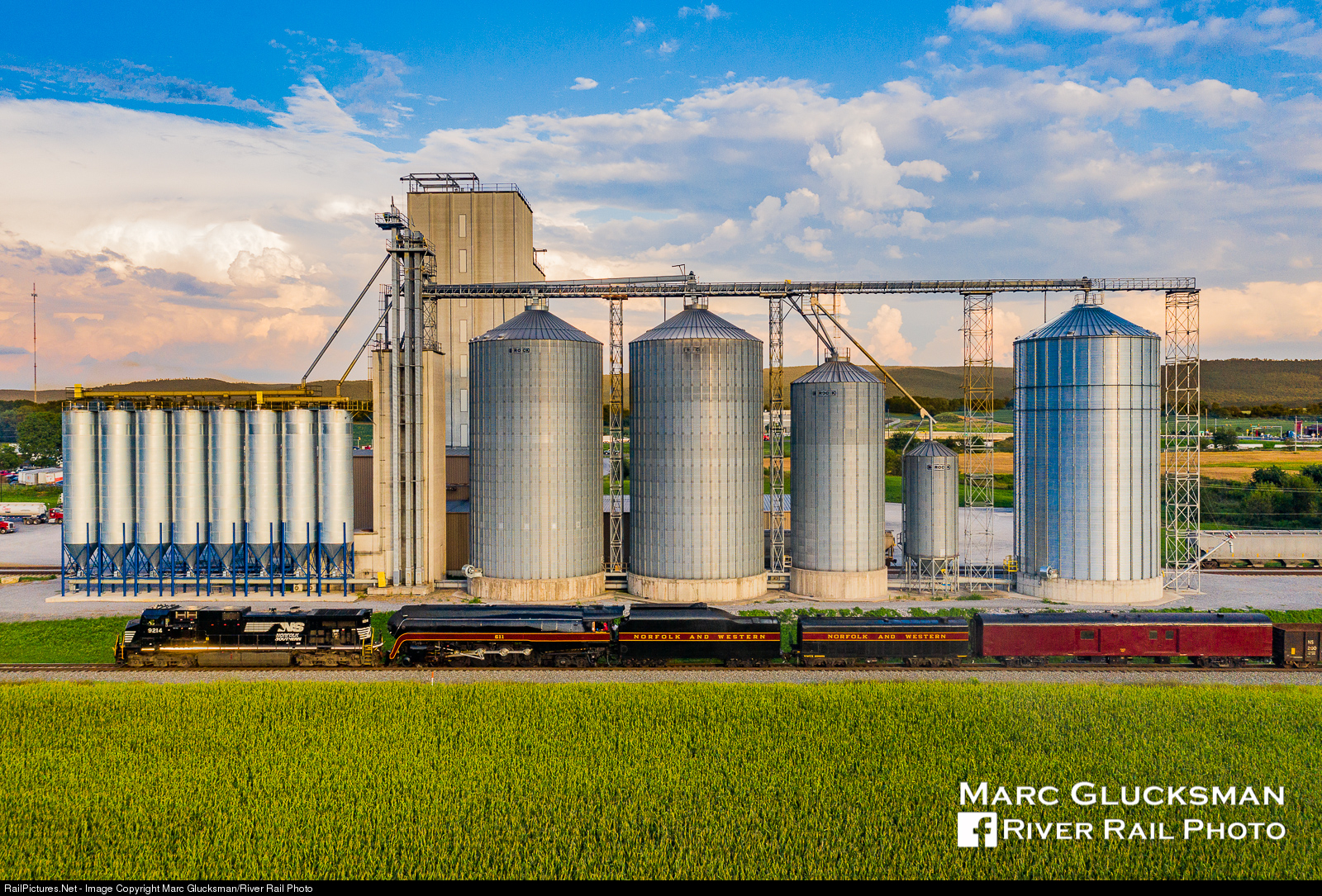 | Perspective is good. Norfolk Southern Corp Train 955 is catching the last light as is rolls through Shippensburg, PA on the evening of August 20, 2019. The large silos of Wenger Feeds by Possum Hollow Road frame the rural scene as NS 9214 (GE C40-9W/Dash 9-40CW) is in the lead of the Virginia Museum of Transportation's legendary former Norfolk & Western Railway J Class 611 (4-8-4) and its tenders and tool car. The consist would arrive at the Strasburg Railroad the next day, where the Big J would get some needed maintenance and spend a few week wowing huge crowds. |