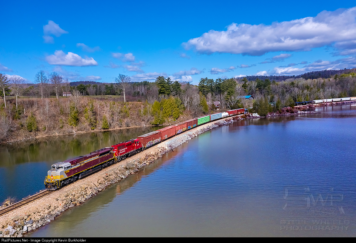 Canadian Pacific Railway train 252-11 is seen snaking along Lake Champlain at Putnam Station, NY with CP Heritage block lettered SD70ACU 7019 leading GP20ECO 2257.