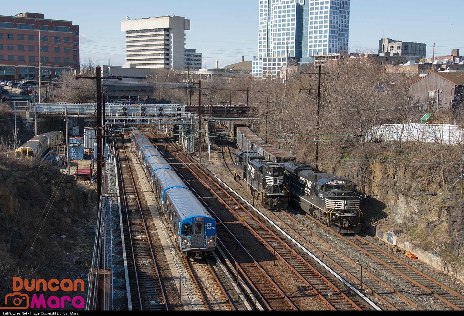 | Conrail PN-13 sets up its trailing unit to around their train of empty trash cars on the Waldo Runaround in Jersey City. As a part of the former Pennsylvania Railroad's Jersey City Branch, it parallels the Hudson and Manhattan (PATH) ROW through Journal Square. |
