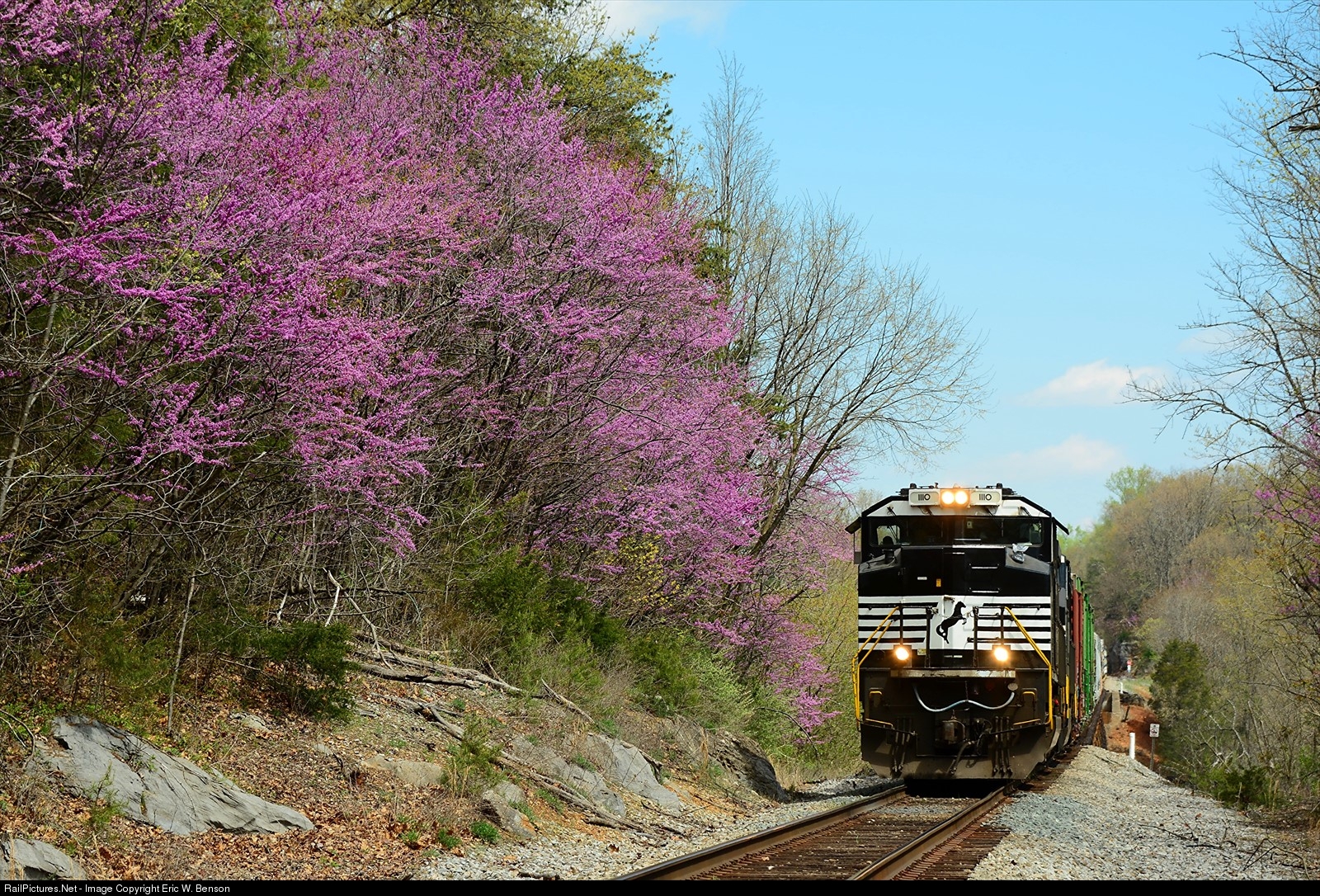 NS train 15T comes south after meeting train 18T just north of Riverton Junction (Ashby/Success) as the redbud continues to bloom in the Shenandoah Valley. #716
