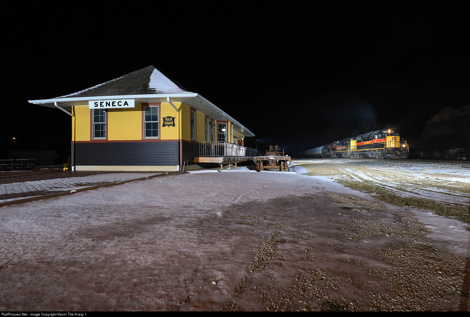 IAIS 150 East leads a very late SIBI by the nicely restored depot at Seneca.