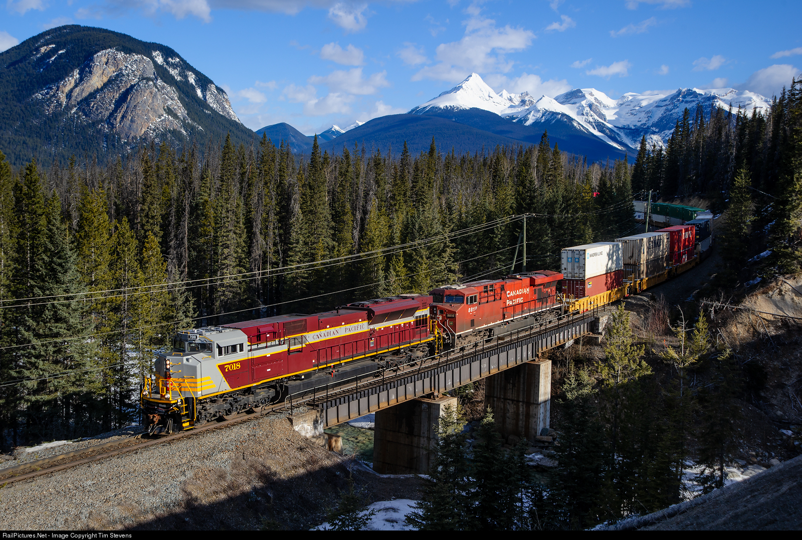 Wearing CP's heritage "block" scheme, CP SD70ACU 7018 leads Toronto Yard-Vancouver IMS train 101-07 across the Ottertail River between Field and Ottertail on CP's Mountain Sub.