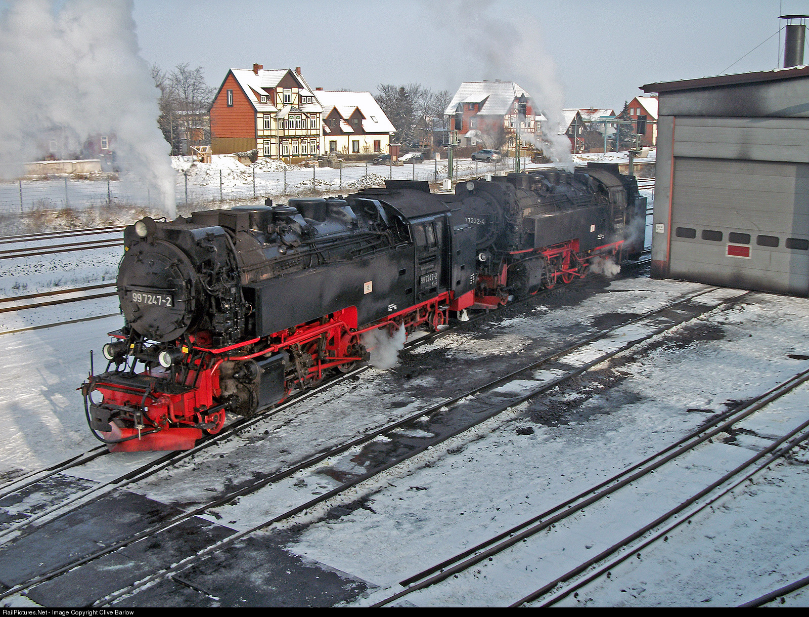 Harzer Schmalspurbahnen 2-10-2 997247 and 997232 stand on the depot at Wernigerode on Saturday 25th January 2014