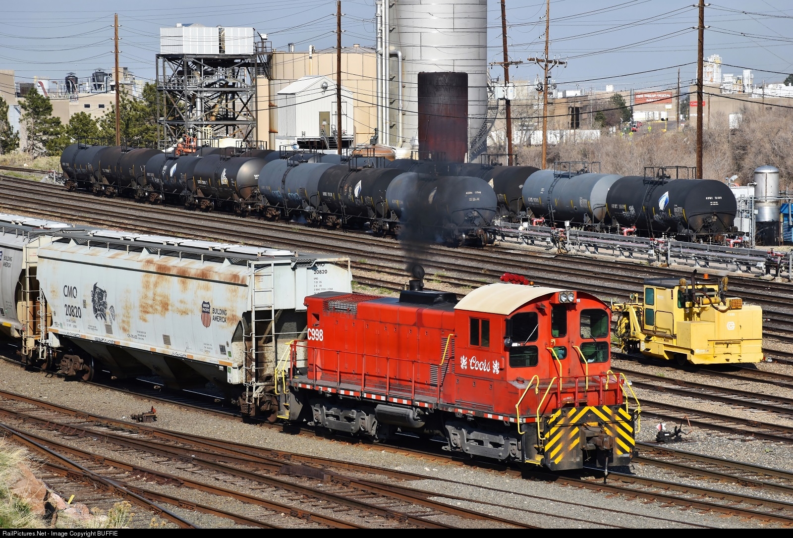 | Coors switcher C998 (SW1001) shuffles some cars in the yard adjacent to the large brewing facility in Golden, Colorado. |