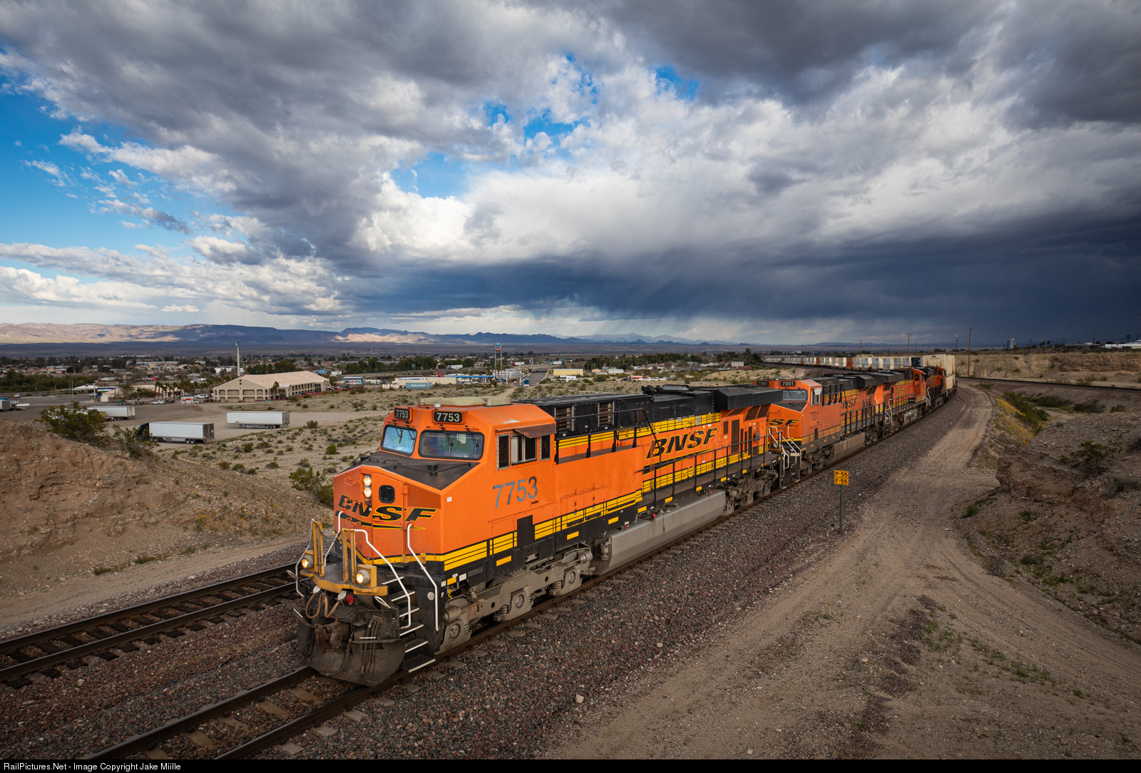As thunderstorms build across the Southwest, BNSF 7753 races a high priority Z train west out of Needles, California. The City of Needles lies in the arid desert along the California-Arizona border. The only things that seem to bring life to this small city (population 5,000) are the Colorado River, Interstate 40 and the BNSF Railway. Crews are swapped here at Needles as trains make the long journey across the BNSF Southern Transcon.
