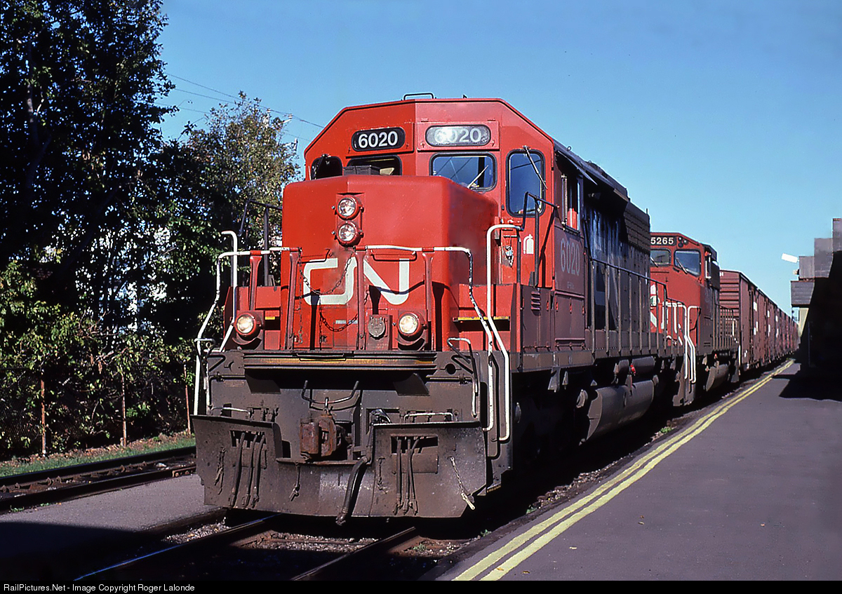 | CN GMD SD40u 6020 with GMD SD40-2W 5265 leads St. Albans-Montreal 323 manifest at St-Lambert, Quebec on September 29, 1999. |