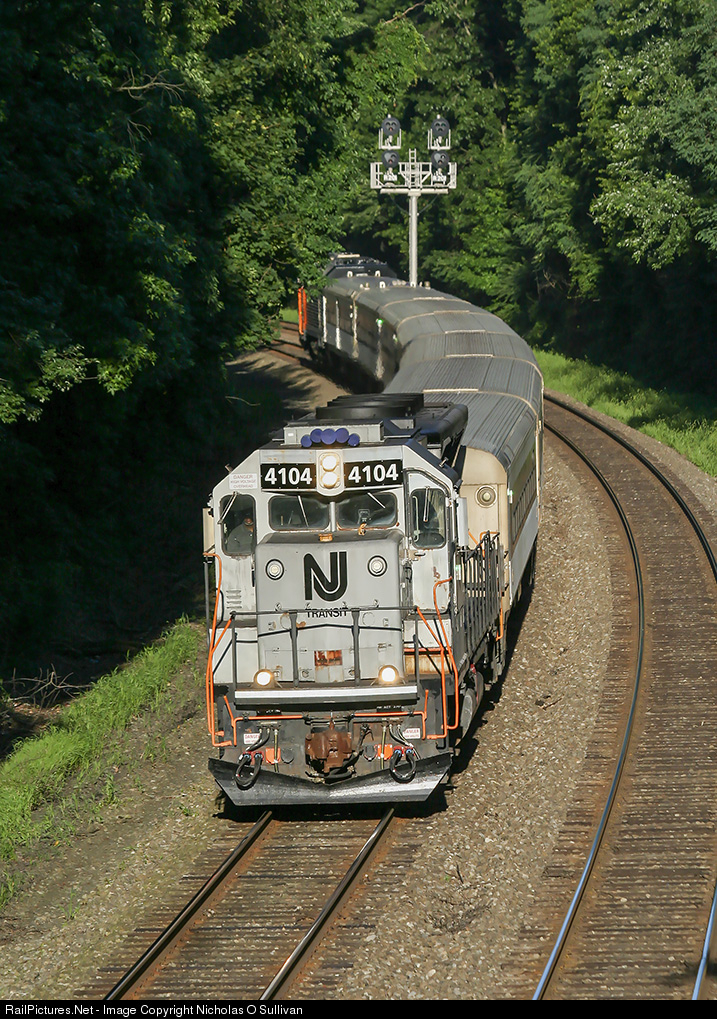 | Geep NJT 4104 (ex GP40P CNJ 3682 and NJT 4111) is acting in place of a cab car today on an eastbound express train from High Bridge. NJT 4027 (PL42AC) is on the rear. |