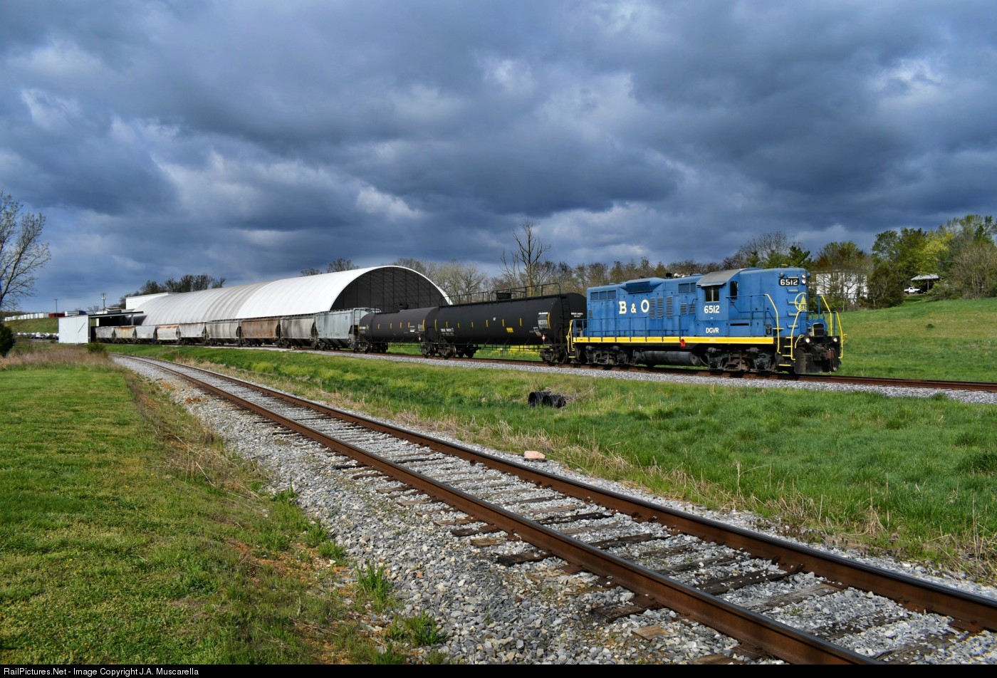 Good Friday and Storm lit B&O Blue! The Shenandoah Valley Railroad has a well known mix of unique power - my personal favorite is the B&O blue GP9. This power has been down for repairs for a little while but was recently put back in service. Thus, when I heard it was running on last weeks train, it was time for a "social distancing" trip to Staunton, VA. As usual, the crew made their morning run toward Weyers Cave and are seen here working Houff Corporation under a beautiful storm lit sky in the Shenandoah Valley. From here they would run around their train and continue back toward their yard, finishing up Good Friday work around noon.