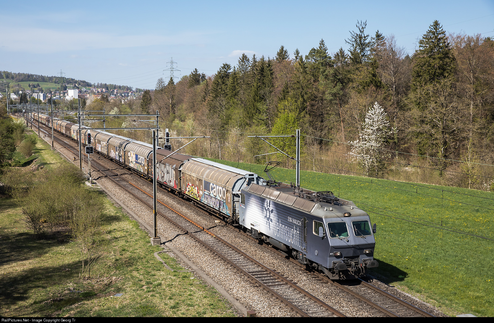 | Re 446 # 017 of the Eisenbahndienstleister Gmbh (EDG), the former SBB Re 4/4 IV # 10103 and later running for the Südostbahn, is pulling the freight train 63184 from Romanshorn to Limmattal shunting yard through Winterthur Tössmühle. On mondays and tuesdays, the EDG is operating this train of SBB Cargo on behalf. |