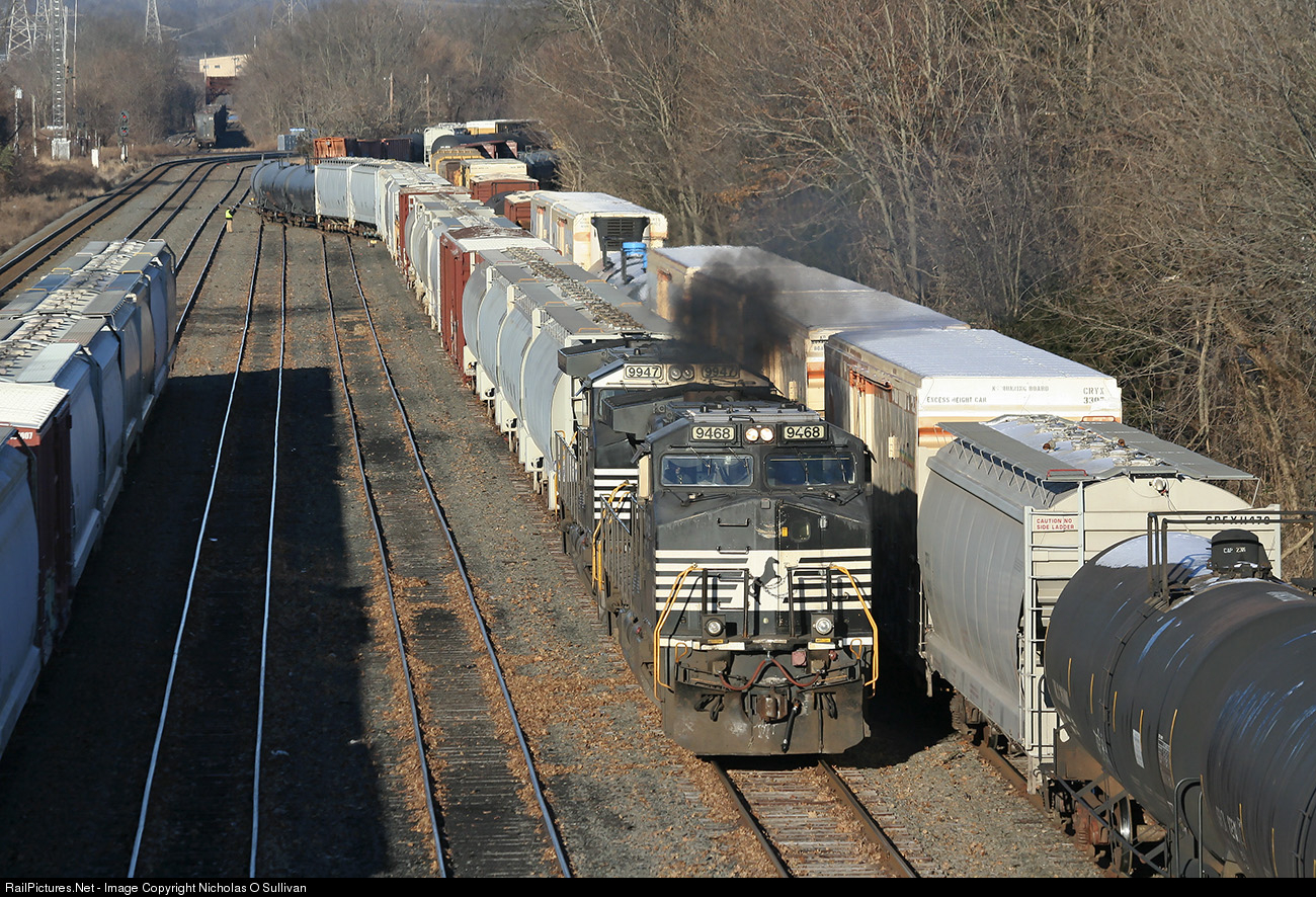 | NS 33K was a train that had been around for about 2 decades. Its size was variable. Sometimes the train would be huge and other times it had no cars at all. The train was abolished by Norfolk Southern in late 2019. When working Manville Yard, 33K would often park much of its train on the Conrail Lehigh Line. In this photo, 33K received permission to bring its entire train into the yard being a manageable length on this frigid afternoon. The conductor can be seen in the distance guiding the engineer in the yard work. NS 9947 (also a C44-9W) is the second unit. |