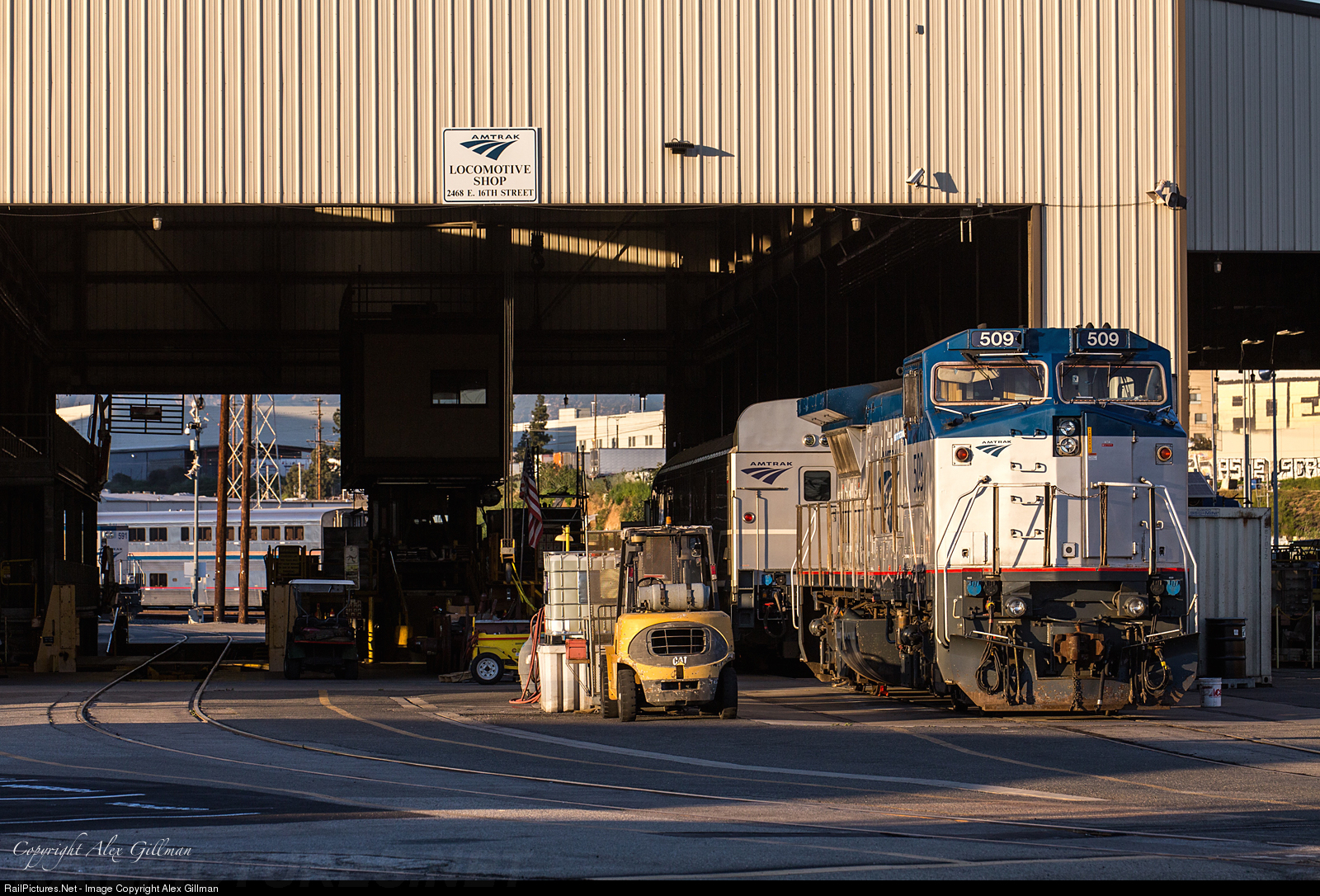 All is quiet at Amtrak's Redondo maintenance shops as the AMKTK 509 soaks up the late afternoon light.