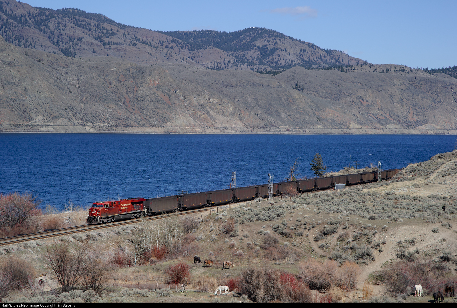 | CP ES44AC 8764 leads a loaded coal train onto the north track of CP's Thompson Sub at Cherry Creek. Kamloops Lake dominates the background, and for once, there are no CN trains in the distance! |
