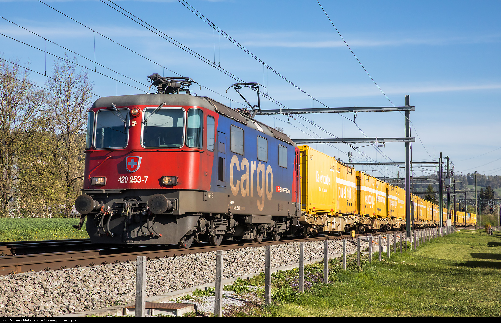| Re 420 # 253 is pulling the parcel mail train 50064 from Frauenfeld to Daillens through Winterthur Tössmühle. The train had 14 Lgnss cars this day, more then usual related to the Corona crisis, because people order things for delivering to home. |
