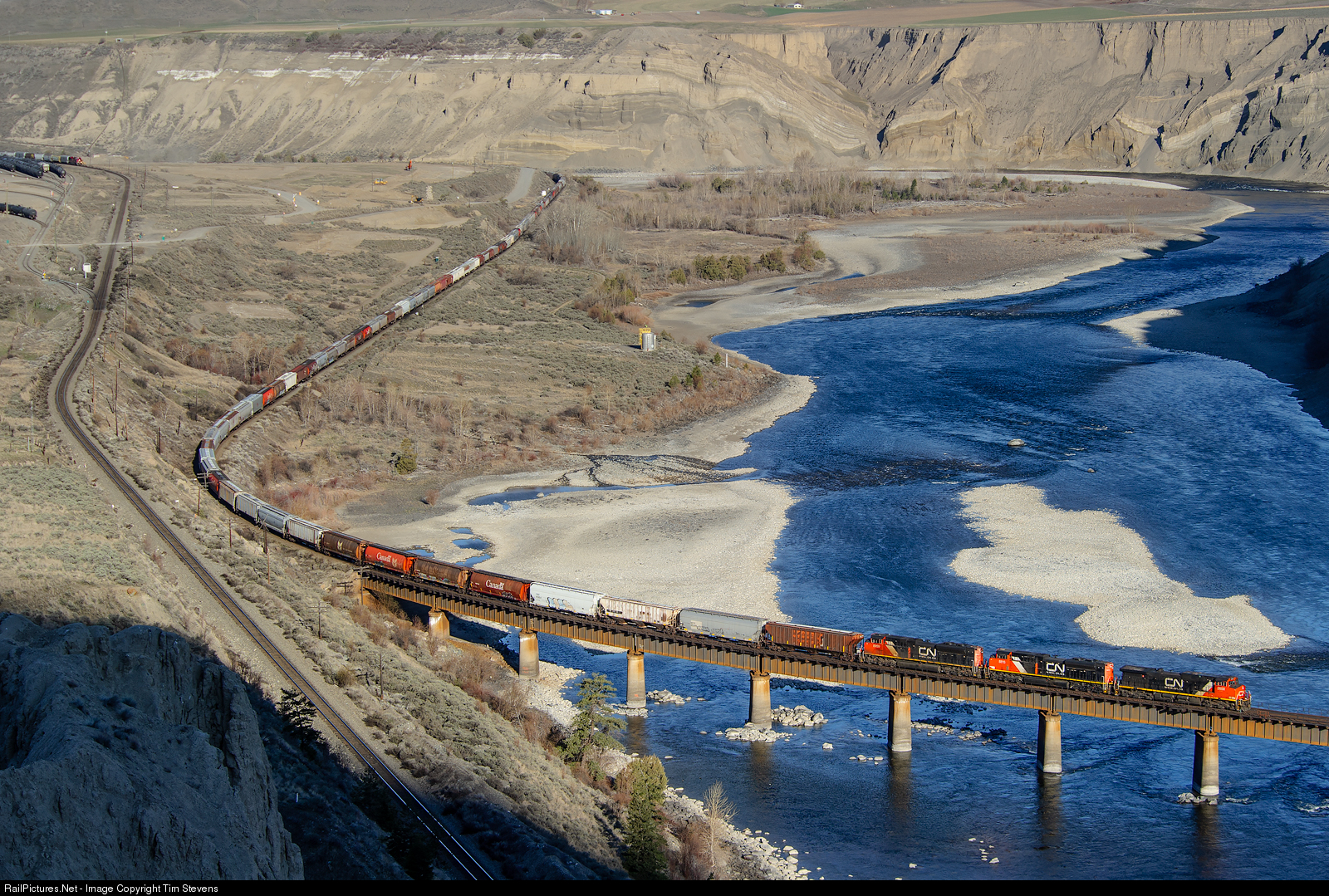 Edmonton bound grain empties cross the Thomspon River east of Ashcroft, BC.