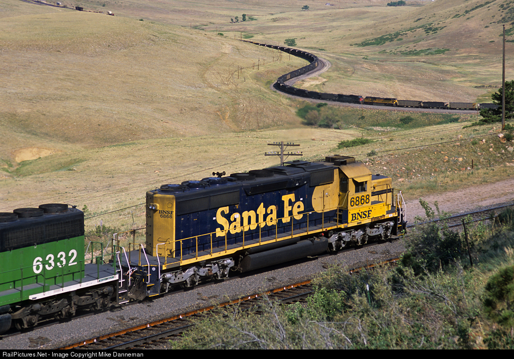 Two SD40-2 locomotives serving as a rear manned helper push on a westbound Burlington Northern Santa Fe freight departing Clay, Colorado, on the afternoon of July 13, 2002. This train just met a Union Pacific coal load that is now heading eastbound through Little 10 Curve at Rocky down below.