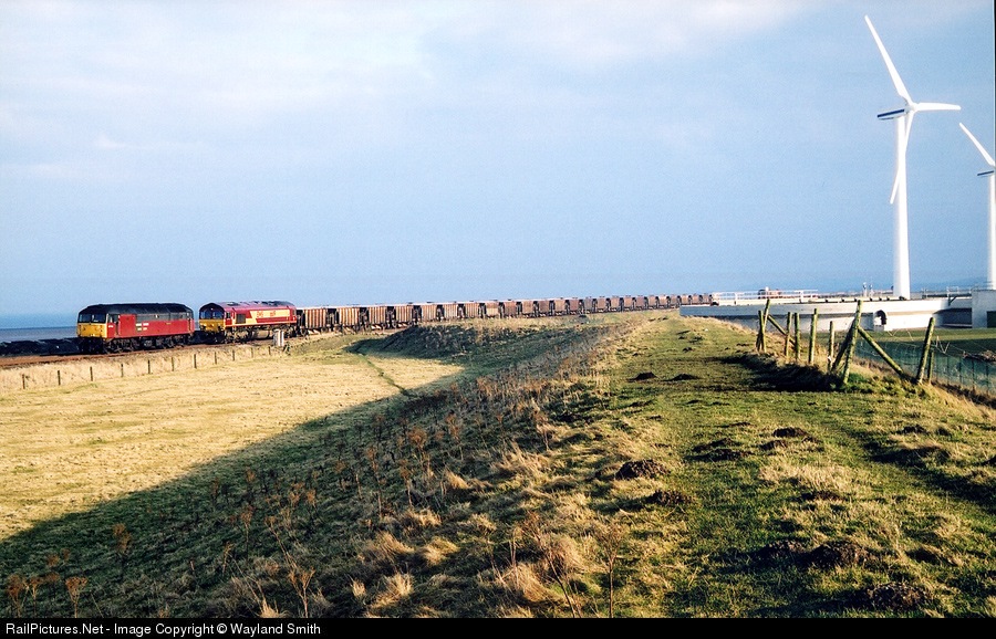 47746 and 66119 wait alongside a rake of ballast wagons on the Cumbrian Coast. Towering above are wind operated electricity turbines.