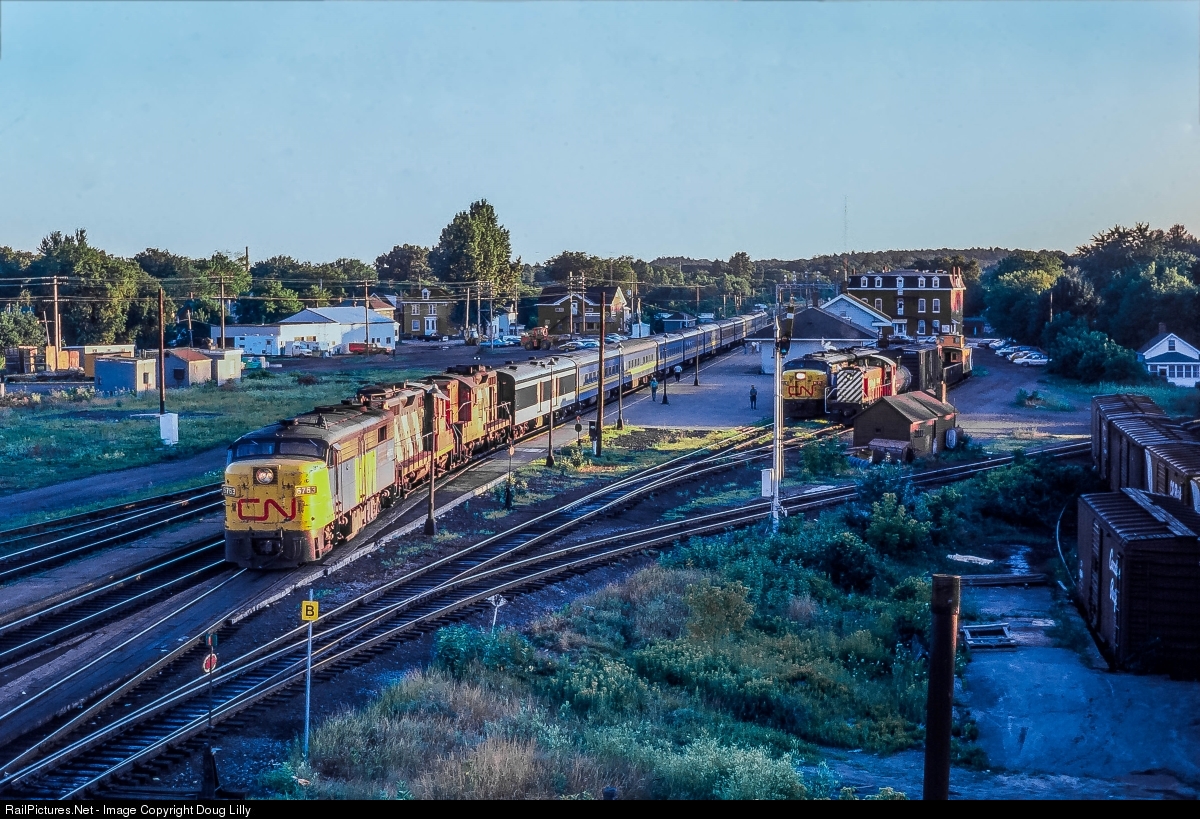 The very last light of a July day illuminates a busy time at the station in Brockville, Ontario. The Ottawa section of a combined train from Toronto will depart behind an FPA4 and two GP9’s. After it clears the area, the two FPA4/FPB4 on the house track will pull forward and then back to take the cars dropped on the main to proceed to Montreal. Once the passenger commotion is over, the CP local will finish its work and head for Smiths Falls. This is the only time I recall seeing GP9’s on a VIA train.