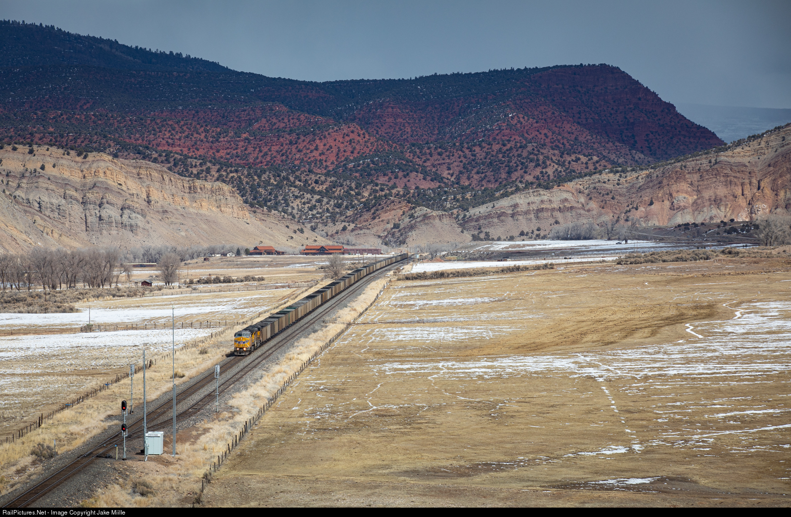 Completed in 1934, the Dotsero Cutoff was built by the Denver & Rio Grande Western Railroad in order to shorten the journey between Denver and Salt Lake City. Previously, westbound trains at Denver were routed south to Pueblo, Colorado. From Pueblo, trains would travel through the Rocky Mountains along the old Tennessee Pass Route. The Dotsero cutoff provided a more direct route through the mountains, shaving off 175 track miles between Denver and Salt Lake City. Today, the Dotsero Cutoff is still active, unlike the abandoned Tennessee Pass Route. Amtrak, BNSF and Union Pacific trains use the cutoff as they travel through the Rocky Mountains along the incredible Moffat Route. In this shot, a Bill, Wyoming to Provo, Utah empty coal repo races west through Range, Colorado. In the distance, a cold storm cell envelops the colorful red mountains of Burns, Colorado.