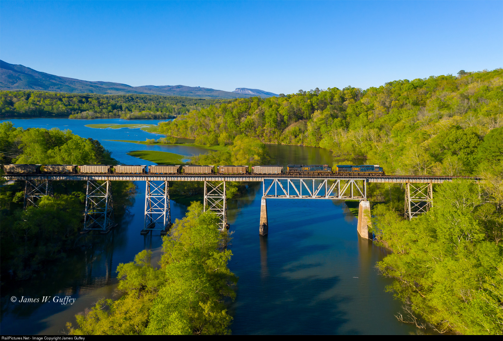 N312, coal loads for Cliffside, crosses the Catawba River and Lake James just north of the Marion siding on the Blue Ridge Sub. The distinctive outline of Shortoff Mountain is in the distance.
